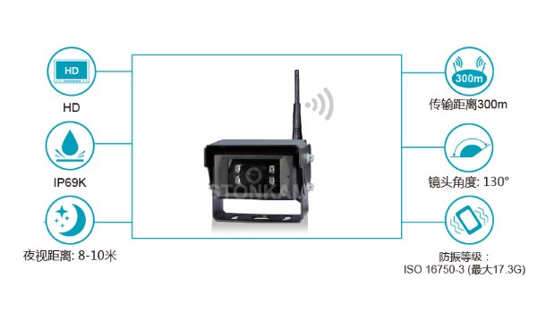 无线传输距离远达300m 支持PAL / NTSC制式 带夜视功能 带麦克风 带防水功能,防水等级IP69K 电源:DC10-32V 可与磁性底座搭配使用,易于安装。 可通过可充电电池供电,使用方便